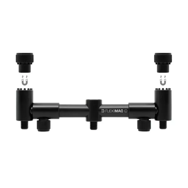 A karok alul laposra vannak vágva, így a rögzítőcsavar meghúzásakor a helyükön maradnak és nem fordulnak el. A FlexiMAG BUZZ masszív alumíniumból készül, fekete, tartós, erős színbevonattal. Két méretben kapható: L-es (rövidebb) két bothoz és XL-es (hosszabb) három bothoz.