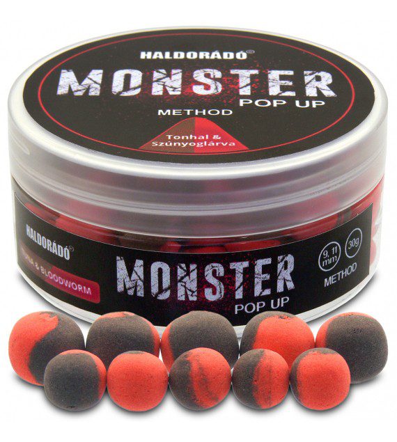 A MONSTER Pop Up Method tégelyében 9 és 11 mm-es változatok találhatók meg. A golyóknak nemcsak ízük, de színük is kevert, így feltűnők a sötétebb színű etetőanyag vagy pellet alapon is.