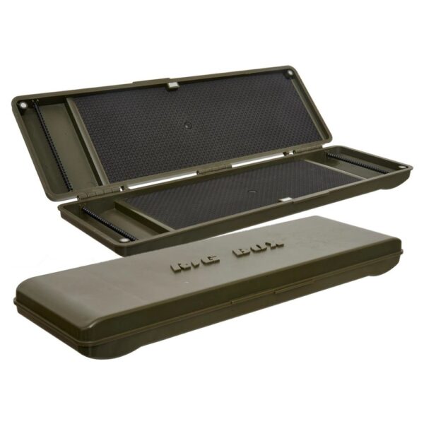 Mágneses doboz szerelékek tárolására. Könnyen zárható és nyitható mágnesekkel. Tartalmaz egy-egy neoprén panelt mindkét oldalán a szerelékek tárolására, valamint egy kisebb rekeszt az aprócikkek számára. Az előketartóba akár 70 előke is belefér. A csomag tartalmaz még csapokat (30 db) a szerelékek rögzítéséhez. Méret: 35×11 cm.