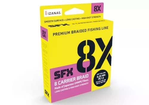 Több év várakozás után megérkezett az SFX 8X fonott zsinór a Sufix kínálatából. 8 szálas, magas szakítószilárdságú japán UHMPE fonatból áll, aminek gyakorlatilag nulla nyúlása van. Tökéletes kontaktot teremtve a halakkal és remek fárasztási élményt nyújt. Az SFX X8 fonott zsinór kimagasló csomótűréssel rendelkezik. A szuper sima zsinór felületnek köszönhető, hogy használat közben nagyon csendes. Lágyan és simán fut ki a bot gyűrűin keresztül, emiatt nagy dobástávok érhetők el vele.